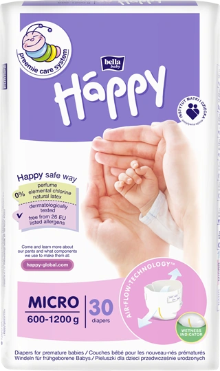 Scutece create special pentru bebelușii născuți prematur. Datorită tehnologiei Preemie Care System, poți fi sigur că micuțul tău primește cea mai bună îngrijire. Siguranța scutecelor Bella Baby Happy Micro este confirmată de testele dermatologice și de avizul pozitiv al Institutului Mamei și Copilului.