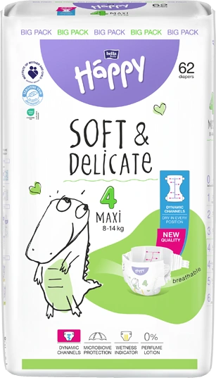 Scutecul Bella Baby Happy Soft & Delicate Maxi oferă confort și siguranță bebelușului. Noua tehnologie a canalelor asigură distribuția rapidă a lichidului și o senzație și mai bună de uscat pentru copilul tău, în orice poziție și la orice oră din zi, iar ajustarea perfectă a scutecului pe corp previne scurgerile nedorite. Calitatea și siguranța scutecelor au fost confirmate de certificatul Dermatest și de avizul pozitiv al Institutului Mamei și Copilului.