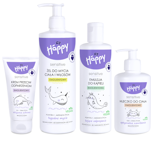 Linia de cosmetice Bella Baby Happy Sensitive a fost creată pentru ca părintele să poată oferi celui mic cea mai bună îngrijire în fiecare moment al zilei. Emulsia de baie fără parfum curăță și îngrijește, iar în contact cu apa se transformă într-un lapte. Datorită formulei bogate, inodoră, creează la suprafața pielii un strat protector delicat, care protejează împotriva pierderii de apă și a acțiunii factorilor externi. Lasă pielea hidratată și regenerată. Elimină senzația de uscăciune și mâncărime. Siguranța produsului a fost confirmată de avizul pozitiv al Institutului Mamei și Copilului.
