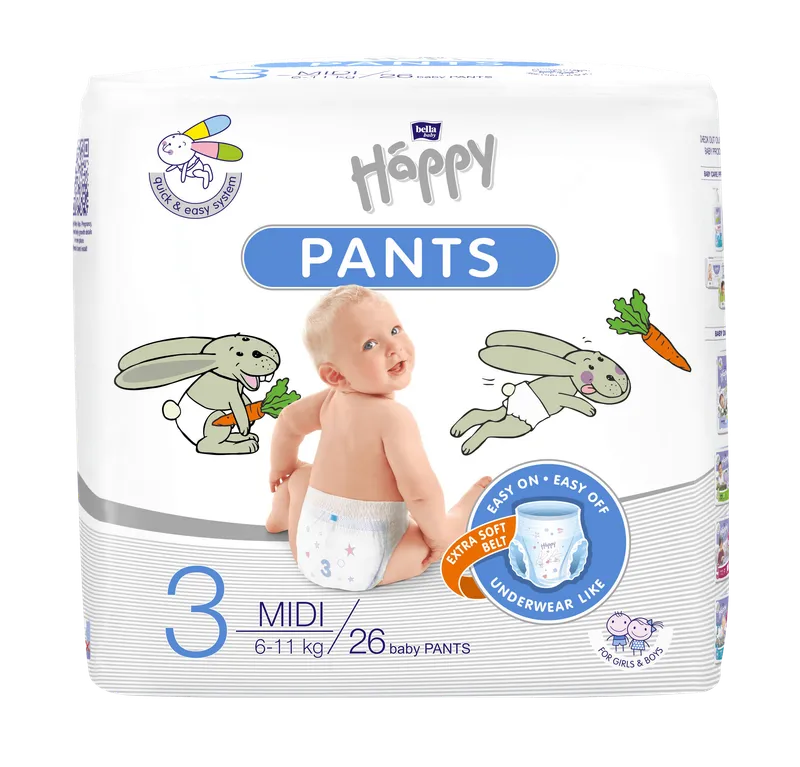 Bella Baby Happy Pants Midi oferă, înainte de toate, confort și siguranță copilului tău care învaţă să fie independent. Sistemul Quick & Easy este modalitatea de a schimba foarte uşor scutecul, pentru ca cel mic să se întoarcă repede la joacă. Siguranța și calitatea produselor noastre au fost confirmate de certificatul Dermatest.